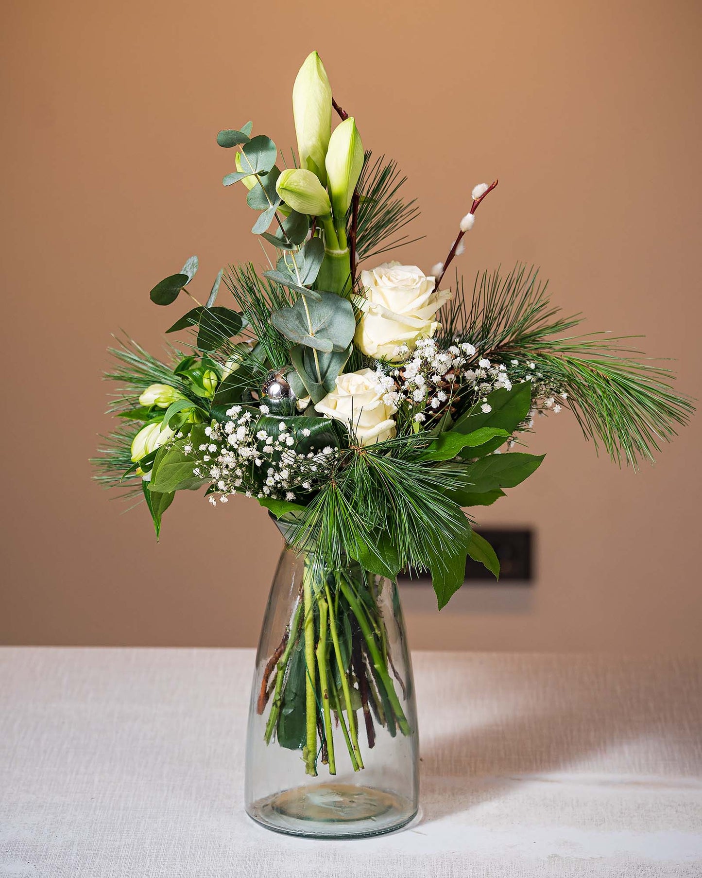 Amaryllis sind die klassischen Blumen zur Weihnachtszeit. Die extravaganten Blüten öffnen sich wunderschön und zeigen ihre tolle Pracht. In der Kombination mit hellen Schnittblumen und Weidekätzchen, kommt die weißblühende Amaryllis super zur Geltung. Ein besonderer Hingucker ist der eingefärbte Asparagus, der dem Strauß die feierliche Note gibt.