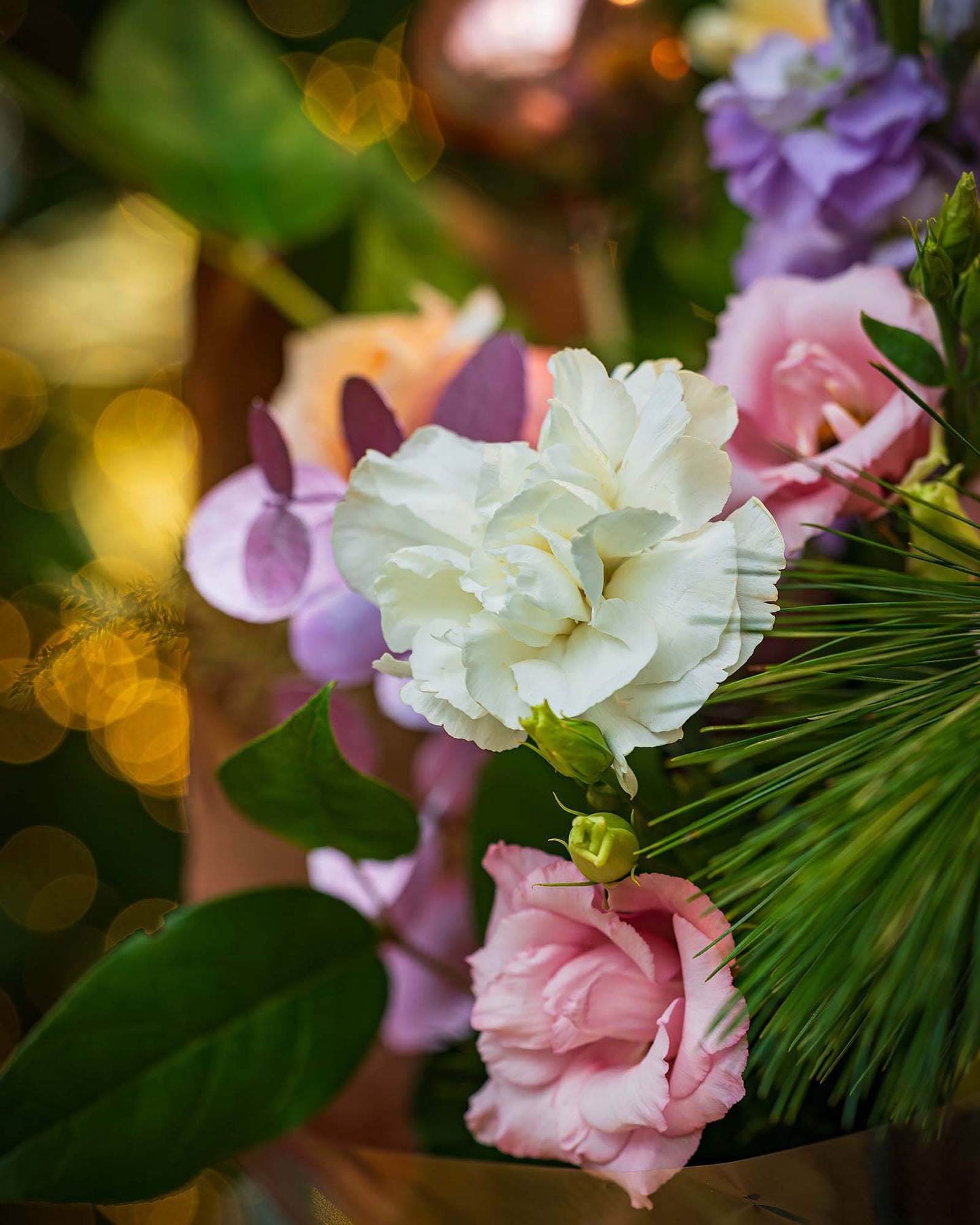 Dieser winterliche Strauß vereint sanfte Rosa-, Apricot- und Cremetöne mit natürlichen Grün- und festlichen Goldakzenten. Unterschiedliche Blütenformen und feine Texturen schaffen eine elegante Leichtigkeit – modern, stilvoll und perfekt für die Winterzeit.