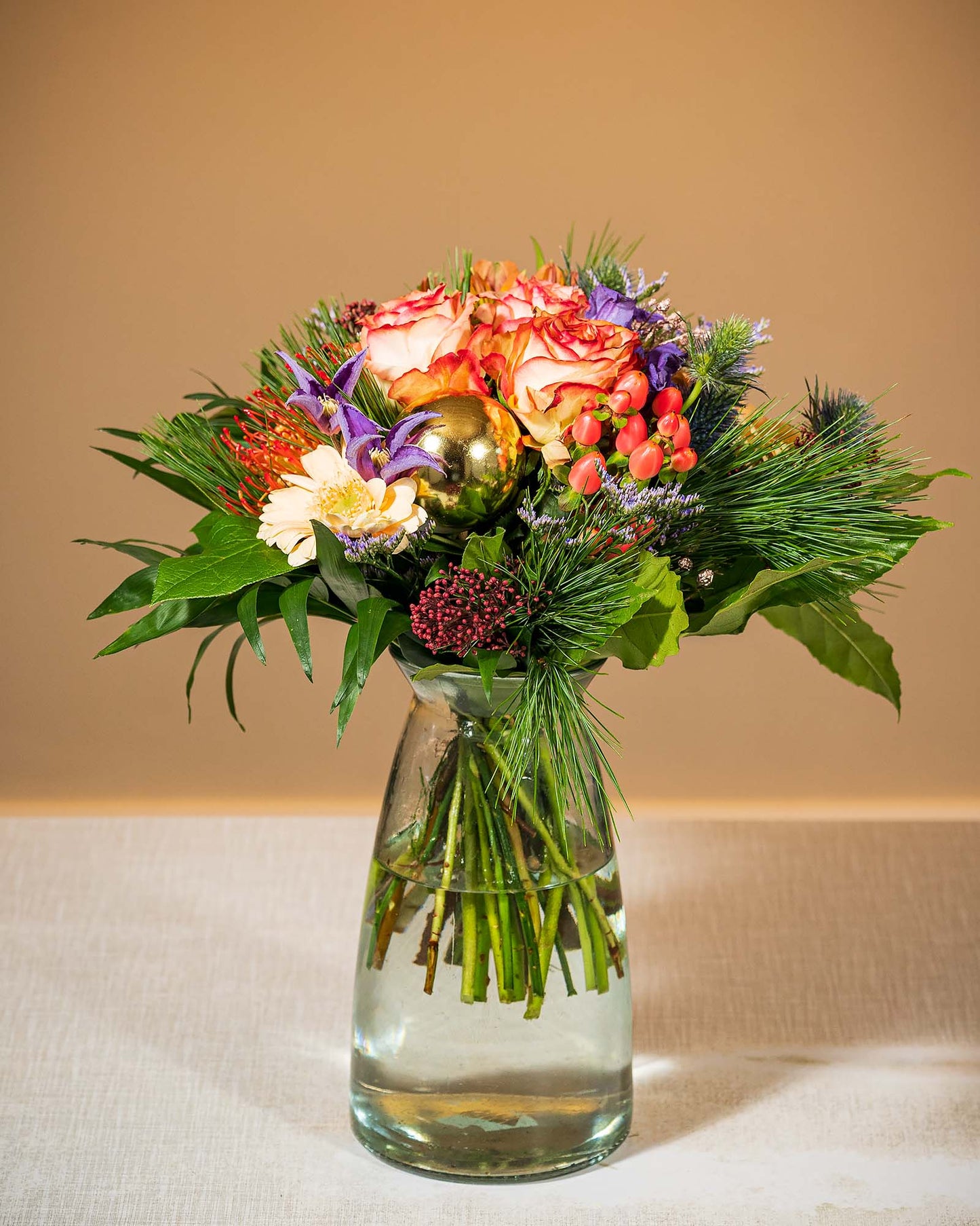 Was gibt es schöneres, als einem lieben Menschen eine Freude zu machen? Dieses Sträußchen hat pastellfarbene Schnittblumen, die mit winterlichem Kieferngrün und einer goldfarbenen Weihnachtskugel kombiniert sind. So passt er perfekt in die Weihnachtszeit und verbreitet eine festliche Stimmung.